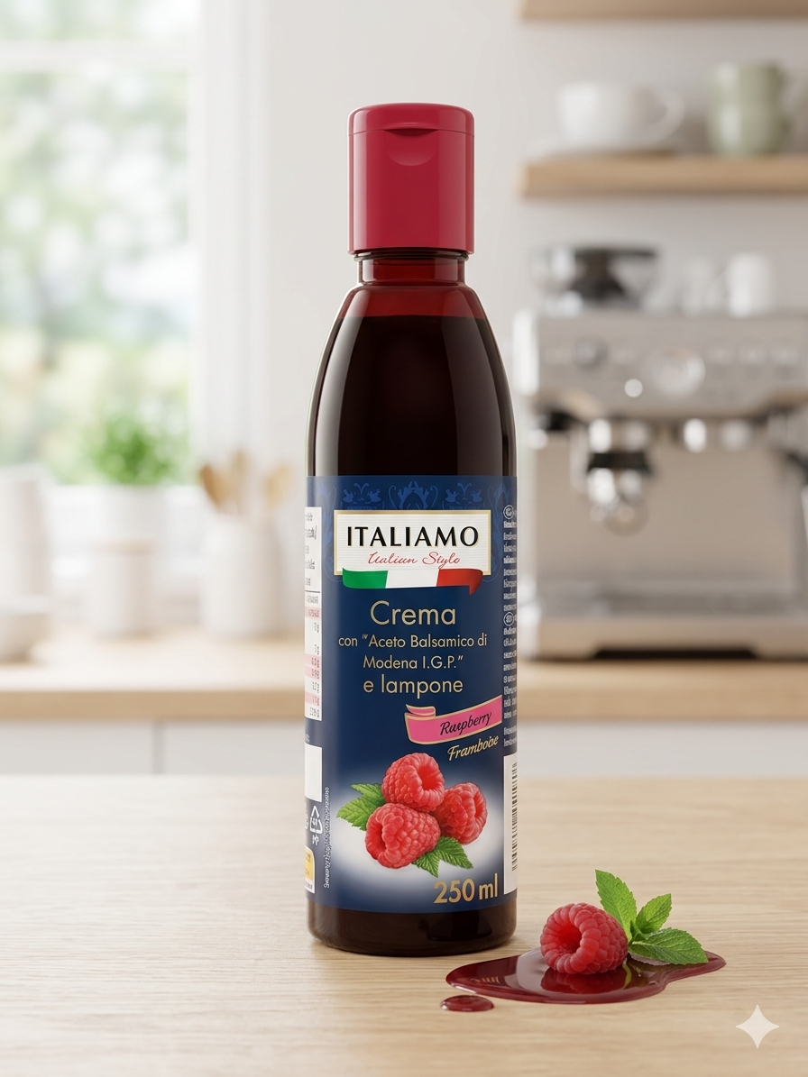 Découvrez la Crema con “Aceto Balsamico di Modena I.G.P.” e lampone de la gamme Italiamo. Cette crème balsamique n’est pas qu’un simple condiment, c’est une véritable signature gustative qui transforme vos recettes du quotidien en plats de chef.