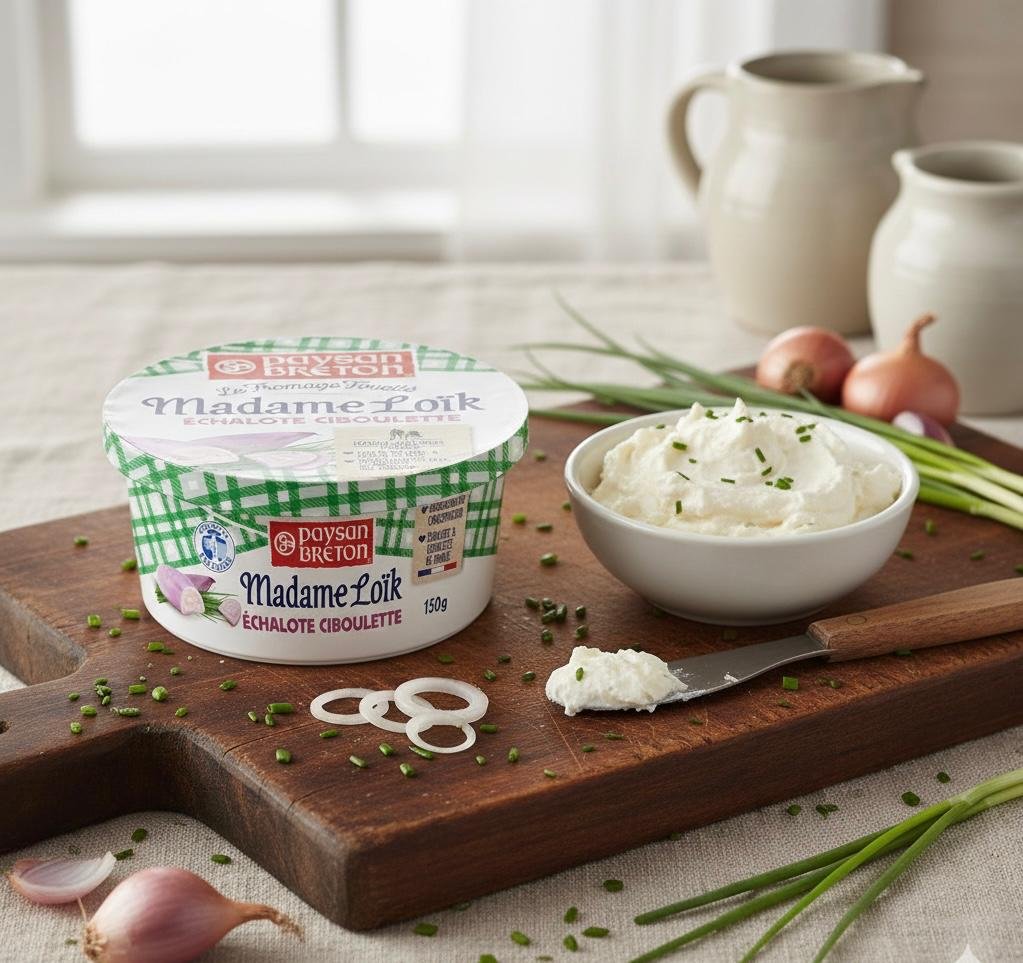Madame Loïk Échalote & Ciboulette Paysan Breton est un fromage frais fouetté reconnu pour sa texture légère et son goût délicatement aromatisé. L’alliance de l’échalote et de la ciboulette apporte une fraîcheur herbacée qui sublime le caractère doux et crémeux du fromage.