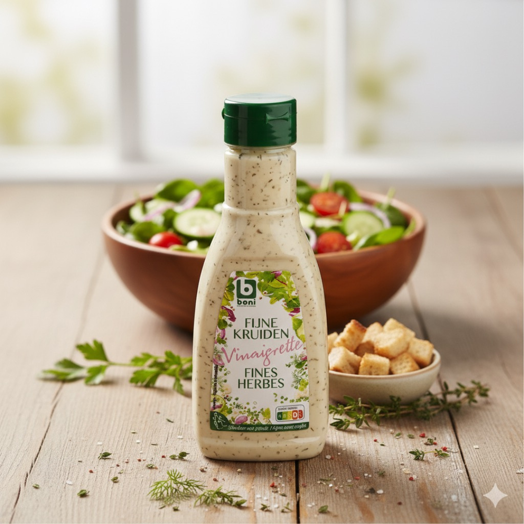Rehaussez le goût de toutes vos salades avec la vinaigrette crémeuse aux Fines Herbes Boni. Élaborée avec un mélange délicat de fines herbes sélectionnées, cette vinaigrette apporte une touche de fraîcheur et d’onctuosité à vos légumes verts, tomates et concombres. Son goût équilibré est parfait pour une utilisation quotidienne.